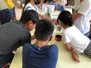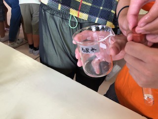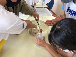 水上置換法で炭酸水のあわを試験管に集めて性質を調べています。