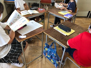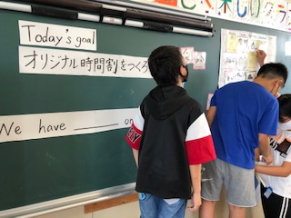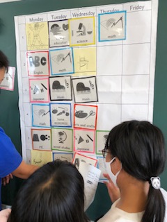 英語で教科の名前を学び、英語での時間割を作っています。グループでの話し合いも行っています。(お互いの距離を取るために机の合わせ方も工夫しています)