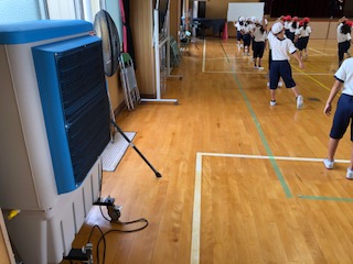 運動会の練習が進めれています。体育館には冷風機を置いています。