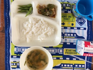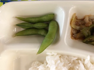 今日の給食は、ホイコウロー、中華スープ、枝豆、ごはんです。
