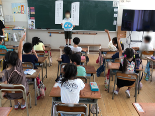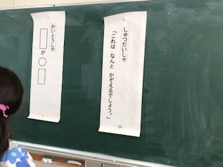 自分の描いた絵をみんなに見せて「これはなんとかぞえるでしよう。」と質問します。聞いた友だちは手をあげて「だんごむしが九匹います。」のように答えていきます。