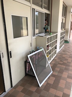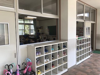 密な状態を避けるため、教室に入っていただく保護者の方の人数を制限しております。廊下から参観しやすいように教室の廊下側の窓をはずしております。ご理解とご協力をお願いいたします。