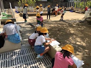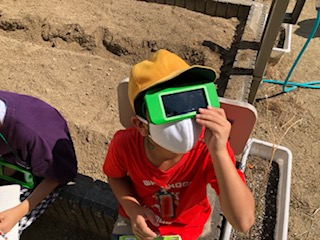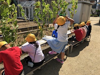 晴れの日をいかして、太陽と影について学習しています。太陽グラスを使って安全に太陽も見ています。