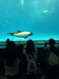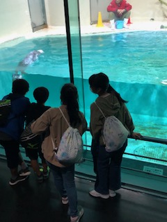 イルカやラッコを見たり、班でおしゃべりしたりして楽しいひと時を過ごしています。