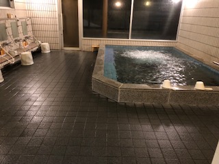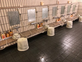 子どもたちの入浴が終わった後に男風呂を撮影しました。コロナ対応で脱衣箱や洗い場の間隔を開けています。子どもたちの入浴も少人数で行いました。