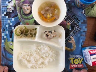 今日の給食は、ウインナーと野菜のスープ、もやしとピーマンのソテーです。