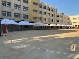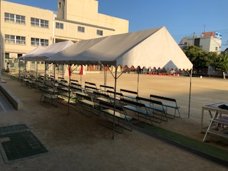 児童席にはテントを張って長椅子を並べています。