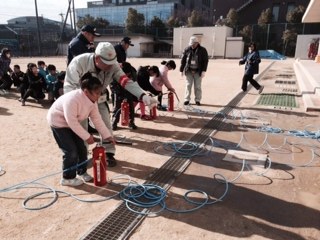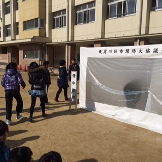 消火器体験、震度体験、煙中体験の様子です。消火器体験では水圧に負けないように力を込めて、震度体験では、恐ろしい揺れに必死出耐えて、煙中体験では、煙の中の迷路を歩きました。怖かったと思いますけどいい体験ができたと思います。