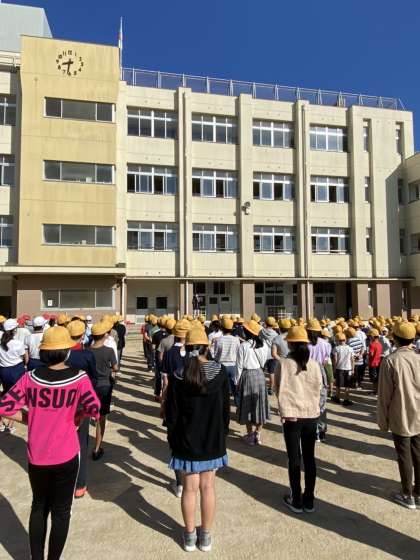秋晴れの下で児童朝会を行いました。大阪府警から学校にいただいた交通安全活動の表彰状が紹介されました。
