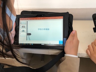 学校の幸福論をテーマにタブレットを使って活動しています。