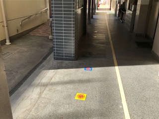 玄関を入られて右へお進みください。間隔を開けるために廊下にマークがはってありますのでその上に立ってお待ちください。