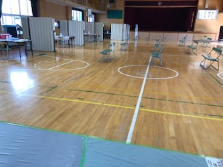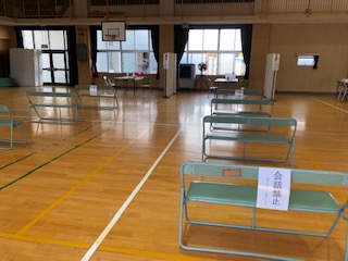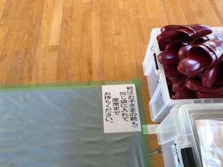 講堂に入られたら靴を脱いで上靴やスリッパで椅子にお座りください。会話を控えてお子様といっしょに座ってお待ちください。