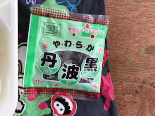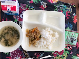 今日の給食は、ピリから丼、中華スープです。ソフト黒豆もつきました。