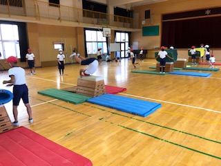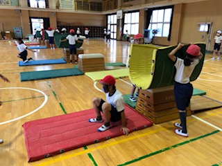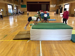 体育館でとび箱運動に取り組んでいます。