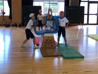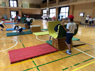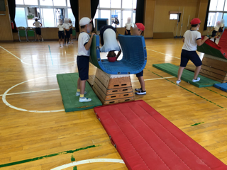 とび箱にマットを置いて、横に補助の子どもたちも立って台上での前転を練習しています。