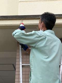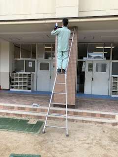 管理作業員は、日々校舎の整備を行っています。今日は校舎のひさし部分のひび割れを補修しました。