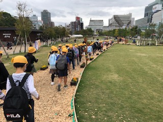 玄関で記念写真を撮ってからてんしばの中を通って学校へ向かいました。