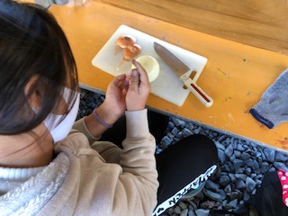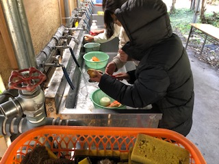 野菜を切る、皮をむく、まきの用意をするなどの分担をして飯ごうすい飯を進めていきました。
