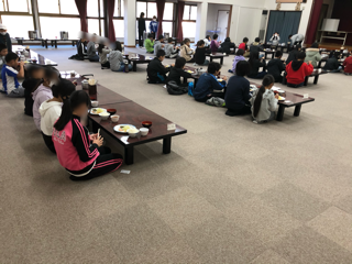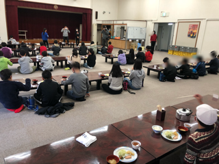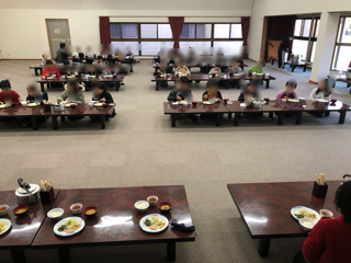 子どもたちが向き合わないように大広間で同じ方向を向いて食べます。
