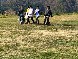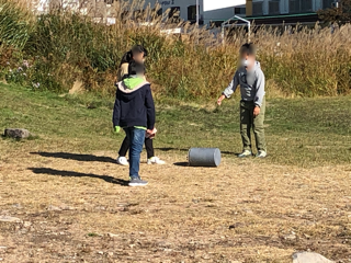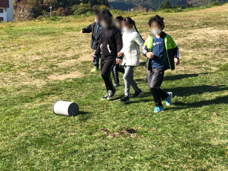 塩ビの容器を転がします。高原に広がって班ごとにゴロゴロがんばります。坂をうまく使っている班もありました。