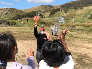 シャボン玉も大人気です。大きなシャボン玉やなかなかこわれないシャボン玉などが次々と出てきてみんな大喜びでした。
