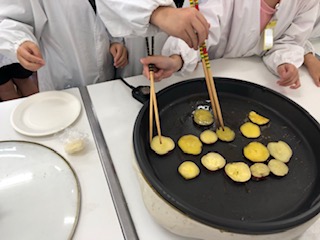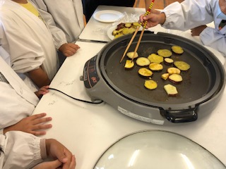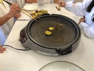 長いおはしにとてもてこずっていますが、何回か裏返しながら両面をていねいに焼いています。