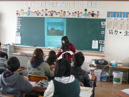 これまでに自分がすんでいる地域のよさを調べてまとめてきました。今日はその発表です。まとめたものを、プロジェクターと拡大機を使って黒板に映しながら紹介しています。