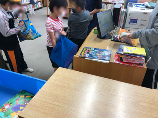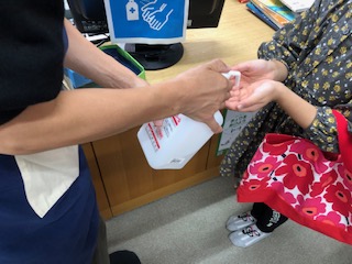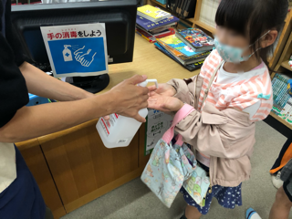 借りていた本を返却しています。この時、手指の消毒をしています。