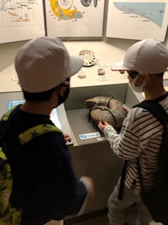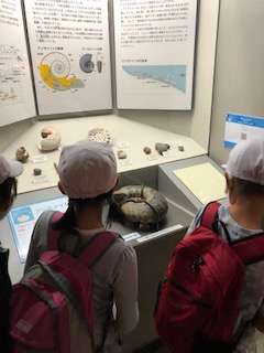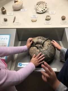 アンモナイトの標本には、さわることができます。
