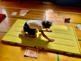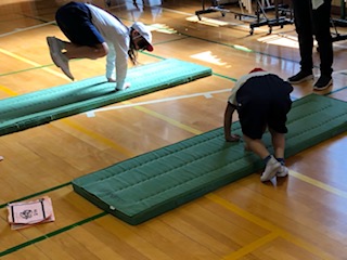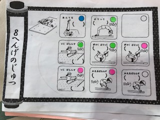 マット運動の技が書かれている学習カードを使って、いろいろなマットを使った運動に取り組んでいます。