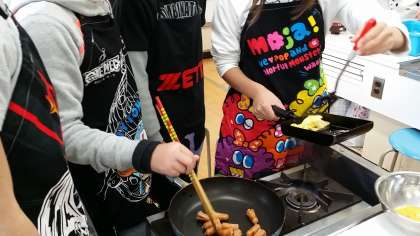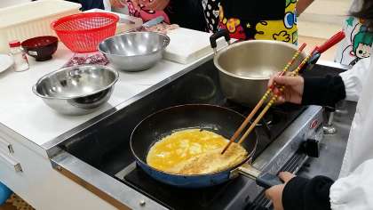 6年生の調理実習の様子です。お弁当作りに挑戦です。アスパラベーコンや玉子焼きをつくり、お弁当箱に詰めました。とてもおいしそうでした。協力して楽しくできていました。