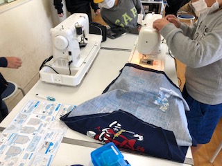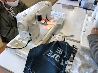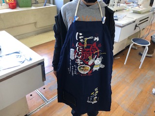 ミシンを使ってエプロンを作っています。完成したエプロンをつけている児童もいます。