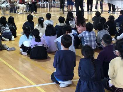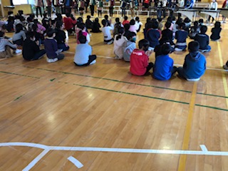 土曜参観の発表に向けて練習にも熱がこもっています。6年生の発表を、土曜参観当日に見られない3年生と4年生が見ています。(6年生の発表の内容は当日のお楽しみです)