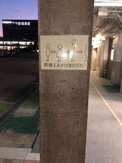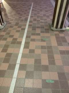 講堂への入場の際には、間隔を開けてお並びください。廊下には並ぶ位置を表す緑の印を貼っていますのでその上でお待ちください。