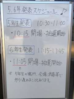 5年生、6年生については講堂の受付でお渡しいただき、座席を決める抽選を行ってください。