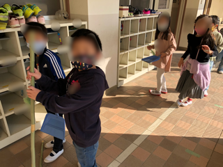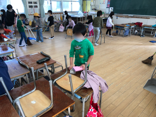1年生がみんなで協力してそうじをしています。
