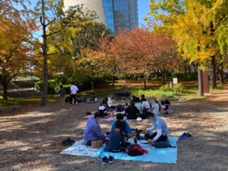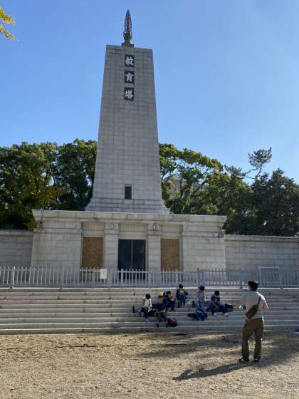 大阪城公園の紅葉の木や教育塔の下でお弁当を食べています。