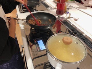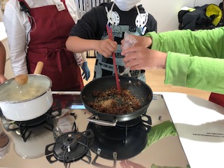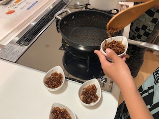 だしをとった後のかつお節も捨てずに炒めてふりかけにします。エコクッキングは、食材やガスのむだをできるだけ少なくする調理を考えています。