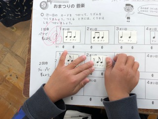 リズムをつくっていきます。前の時間はペアで考えました。今日はグループで考えていきます。話し合って決めたリズムを紙にはっていきました。