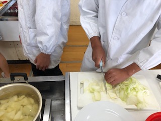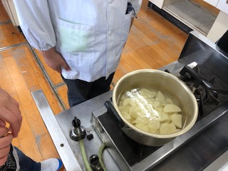 切ったじゃがいもをゆでます。その間にたまねぎを切ります。