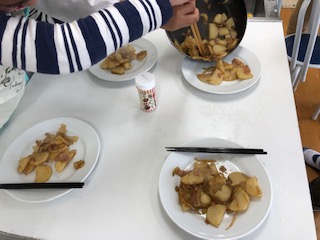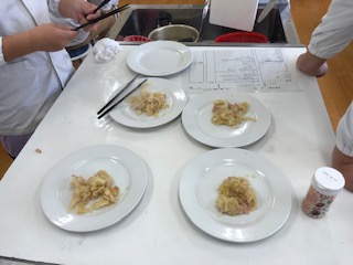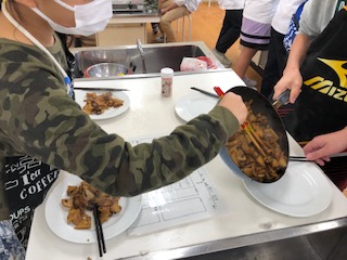 出来上がりです。皿に取り分けます。グループによって仕上がりの色合いはいろいろですがどのグループもおいしく出来上がりました。