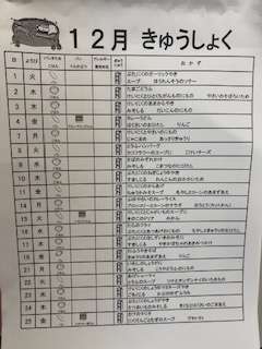 12月の給食献立表が教室に掲示されています。12月は、25日の終業式も給食があります。