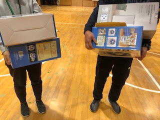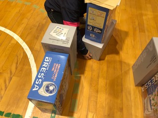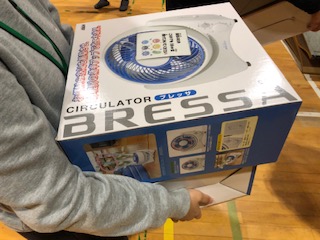 大阪の冬は乾燥します。また、窓も閉めがちになりますので、換気と加湿対策のため、各教室にサーキュレーターと加湿器を置きます。担任が教室に持っていきました。これはコロナ対策予算で購入しています。箱の上には、換気をうながすステッカーもあります。これは教室に貼ります。
