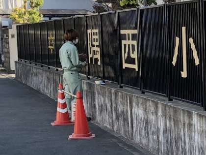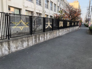 正門横のフェンスに管理作業員が学校名をかいていましたが、この度完成しました。大隅西小学校の校名が道ゆく人にもよくわかるようになっています。(正面よりも斜めから見る方がよく見えます)