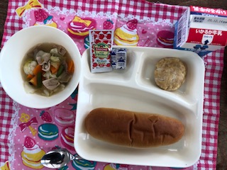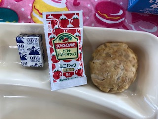 今日の給食の豆腐ハンバーグにケチャップがつきました。