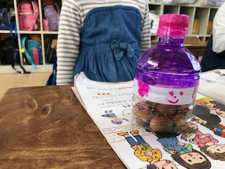 ペットボトルの中にどんぐりを入れた手作りのマラカスです。子どもたちは喜んでリズムをとっていました。