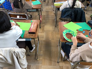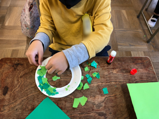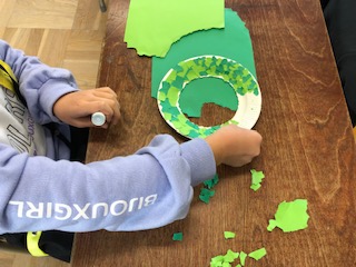 色の紙を張ってリースを作っています。クリスマスが近いのを感じますね。