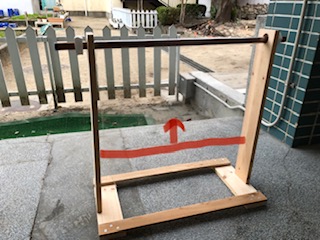 来週、14日・15日・16日は学期末個人懇談会です。コロナ感染対策として担任と保護者の間に透明シートのついたついたてを立てます。(写真の赤い線と矢印が透明シートです)