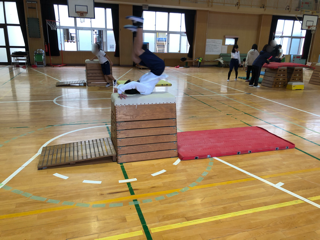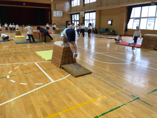 とび箱の上に頭をつけて回る運動に取り組んでいます。