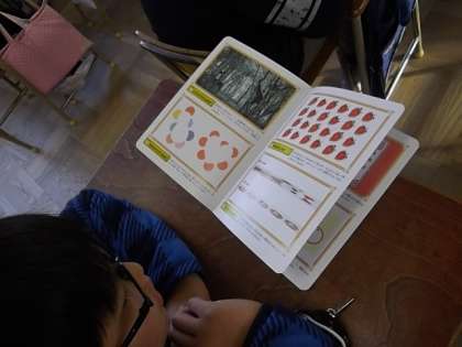 学級文庫には様々な本があります。目の錯覚を利用した「だまし絵」の本を読んでいる子たちがいました。人気があるようです。